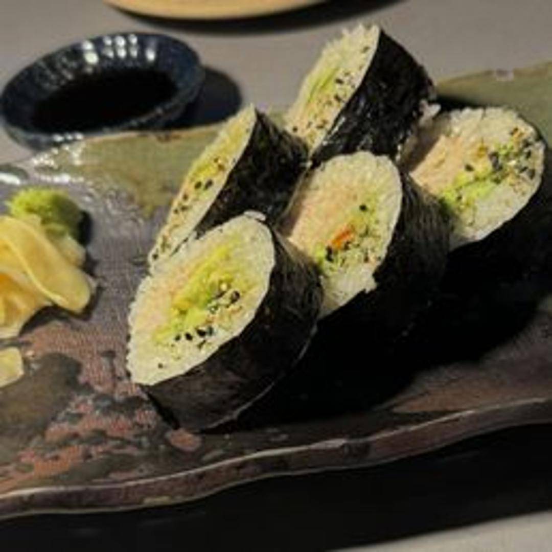 A delicate sushi roll featuring the rich, buttery flavor of black cod paired with sweet, succulent blue crab. Expertly rolled with seasoned sushi rice and nori seaweed, offering a harmonious blend of textures and tastes. Garnished for visual appeal.