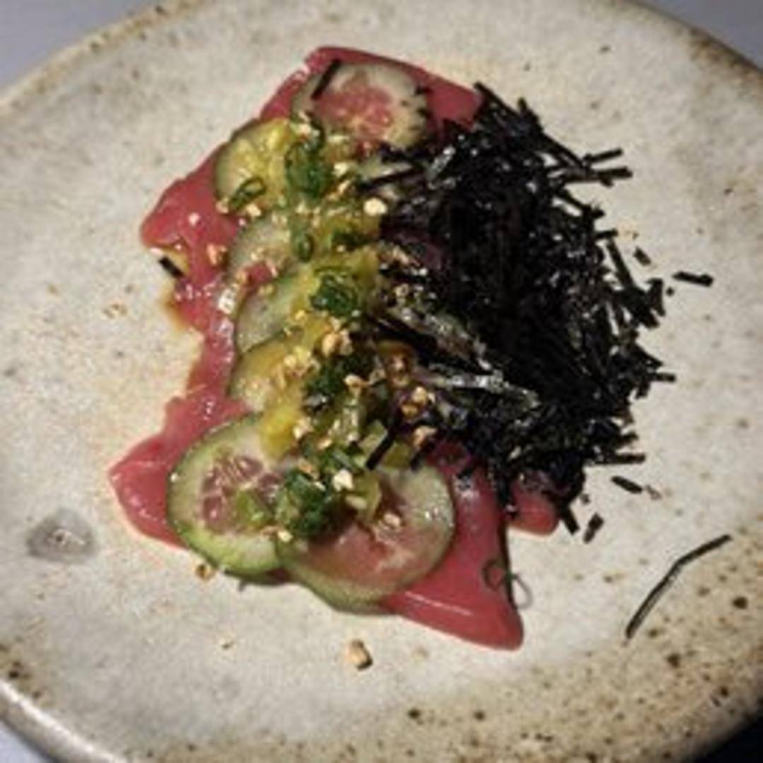 Thinly sliced, impeccably fresh Bluefin tuna, artfully arranged and drizzled with a delicate sauce. The dish highlights the tuna's rich flavor and melt-in-your-mouth texture. Likely garnished with microgreens, edible flowers, and a hint of citrus to enhance the natural flavors.