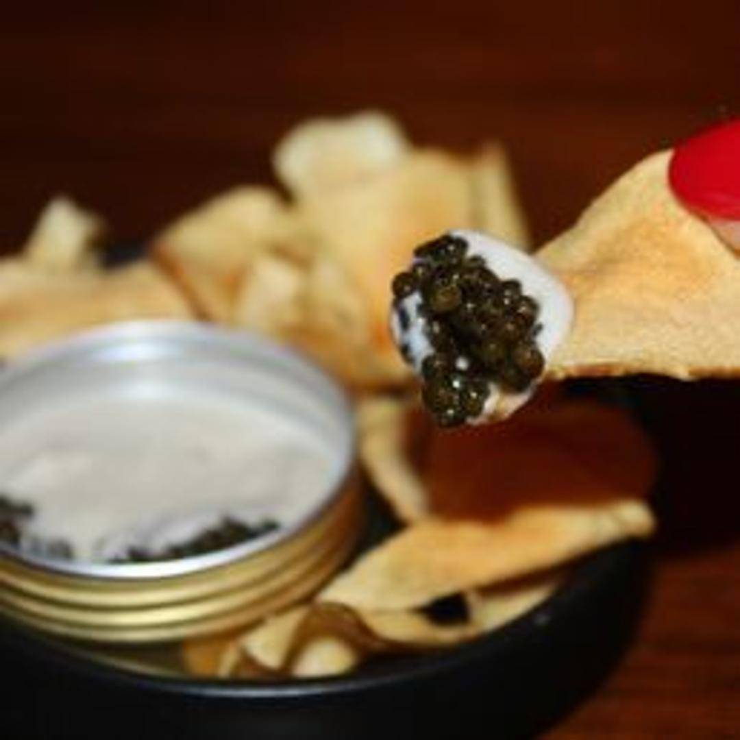 A generous serving of Golden Kaluga Caviar, prized for its large, shimmering eggs and smooth, buttery flavor.