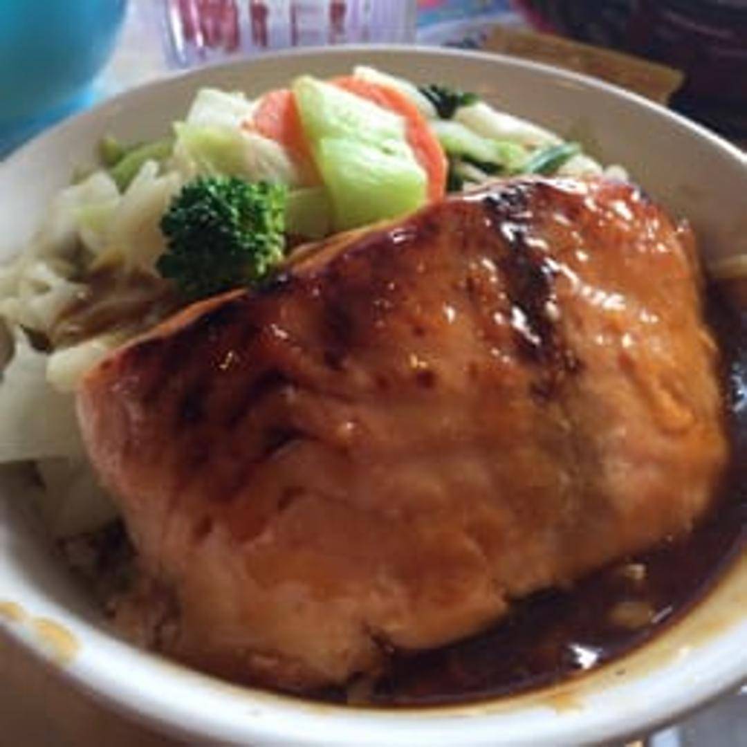 Fresh salmon sashimi over a bed of sushi rice, accompanied by avocado, edamame, seaweed salad, and a light citrus ponzu sauce.