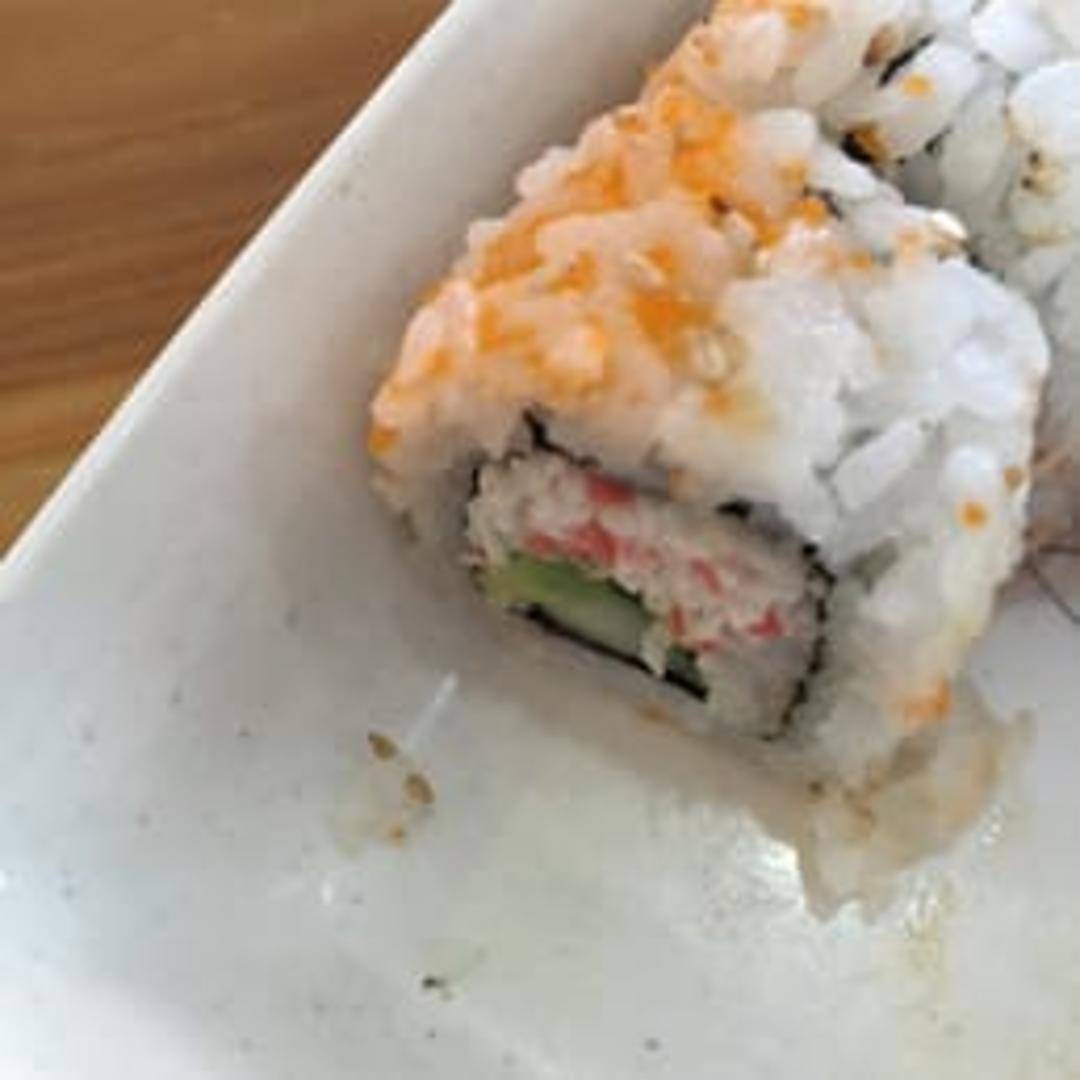 A popular sushi roll consisting of avocado, imitation crab meat (or real crab), and cucumber, rolled in seaweed and rice, often with sesame seeds on the outside.