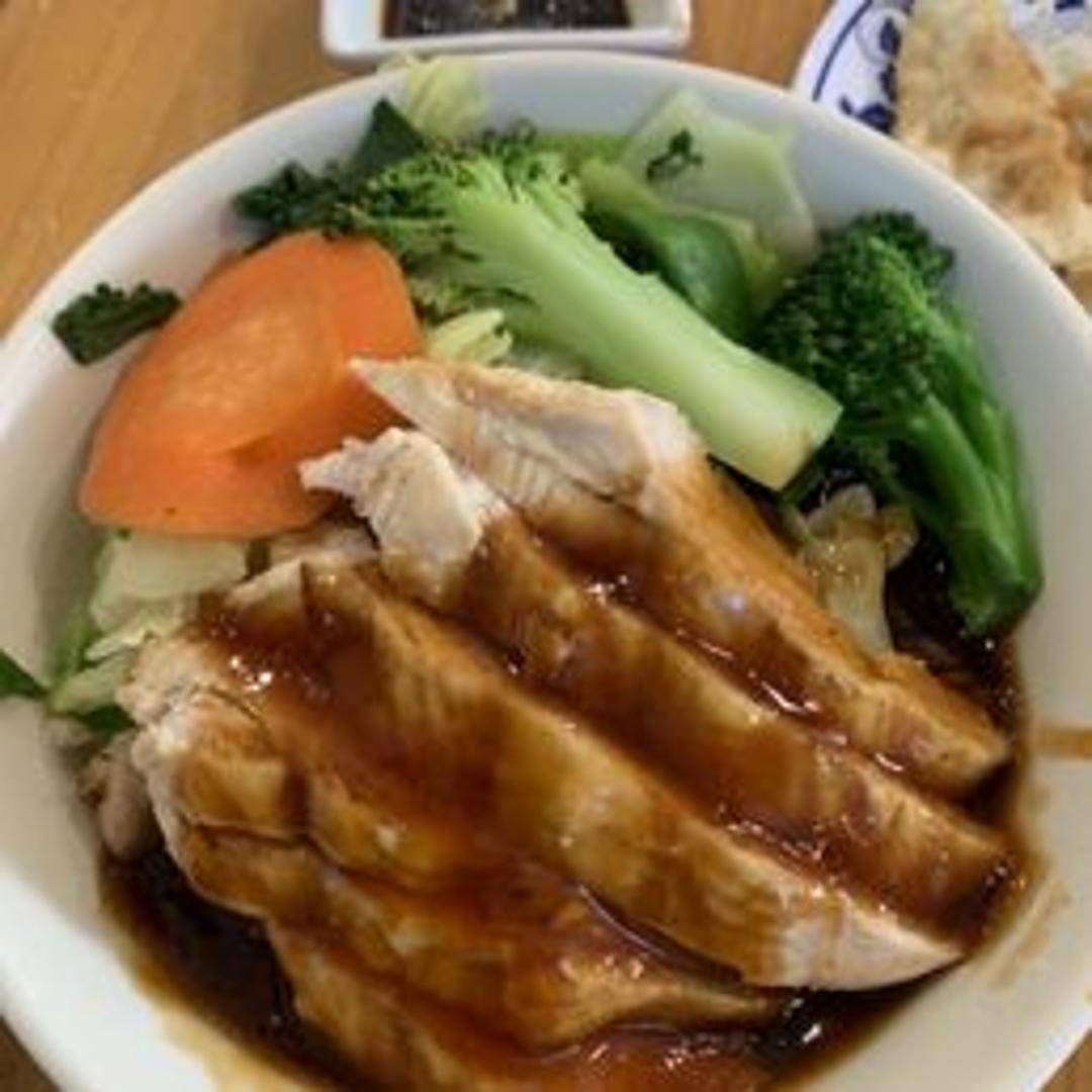 A bowl filled with a variety of fresh and cooked vegetables, potentially including rice or noodles as a base. The specific vegetables may vary but often include leafy greens, carrots, broccoli, and other seasonal produce. Served with a dressing or sauce.