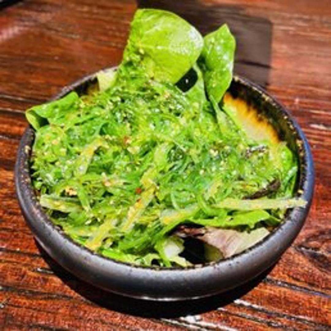 A refreshing and vibrant Japanese salad made from tender, seasoned wakame seaweed. It's typically dressed with a light, tangy sesame oil and rice vinegar dressing, garnished with sesame seeds, offering a unique oceanic flavor and a delightful, slightly chewy texture.