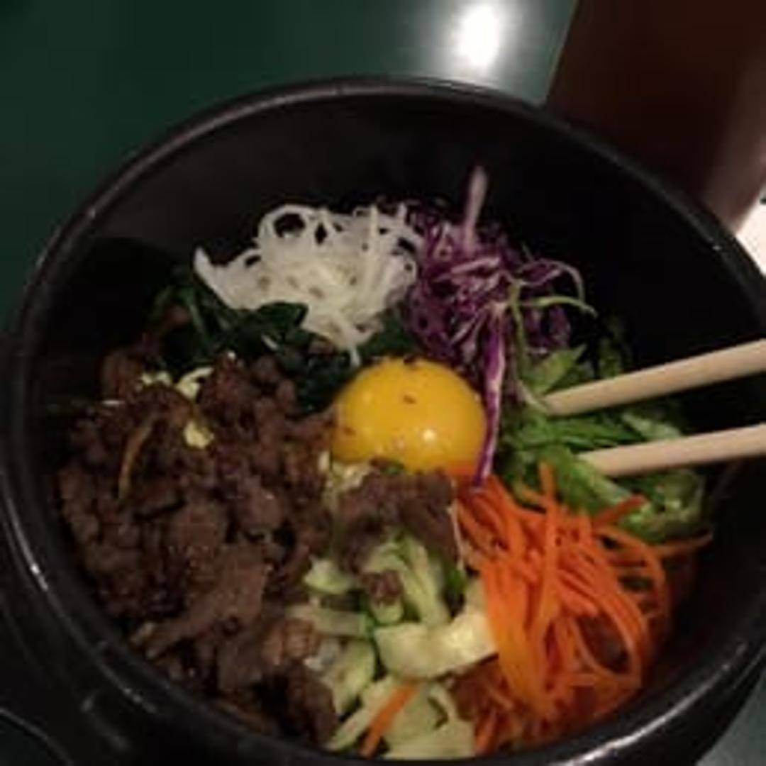 Bibimbap served in a sizzling hot stone bowl. The heat crisps the rice at the bottom, adding a delightful textural contrast. Topped with seasoned ground beef, assorted sautéed vegetables, a fried egg, and gochujang. Mixed vigorously before enjoying.