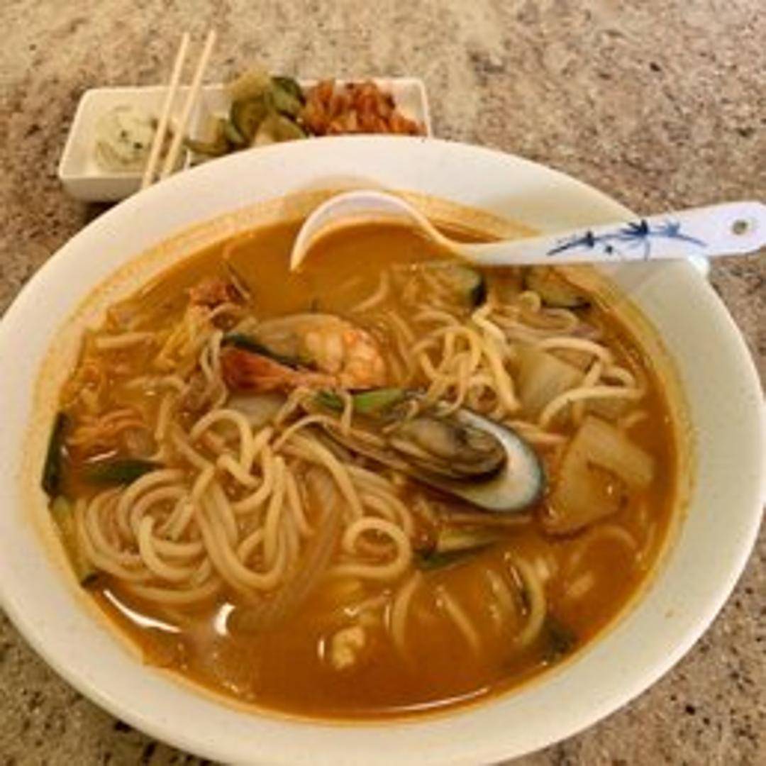 A fiery and flavorful Korean noodle soup. The rich, vibrant broth is intensely spicy, typically made with gochujang (Korean chili paste), gochugaru (Korean chili powder), and other aromatic spices. Features chewy wheat noodles and often includes a variety of ingredients such as vegetables (mushrooms, onions, zucchini), protein (beef, pork, or seafood), and tofu. Garnished with sesame seeds and scallions for an added layer of flavor and texture.