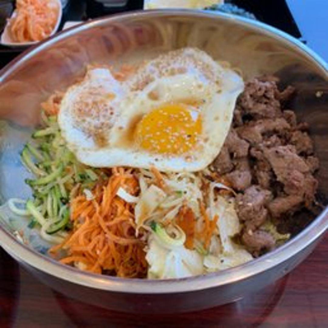 A Korean mixed rice dish. Includes a bed of steamed rice topped with a variety of sauteed vegetables (such as carrots, spinach, and bean sprouts), a protein (often beef or a fried egg), and gochujang (Korean chili paste). Served hot and meant to be mixed thoroughly before eating.