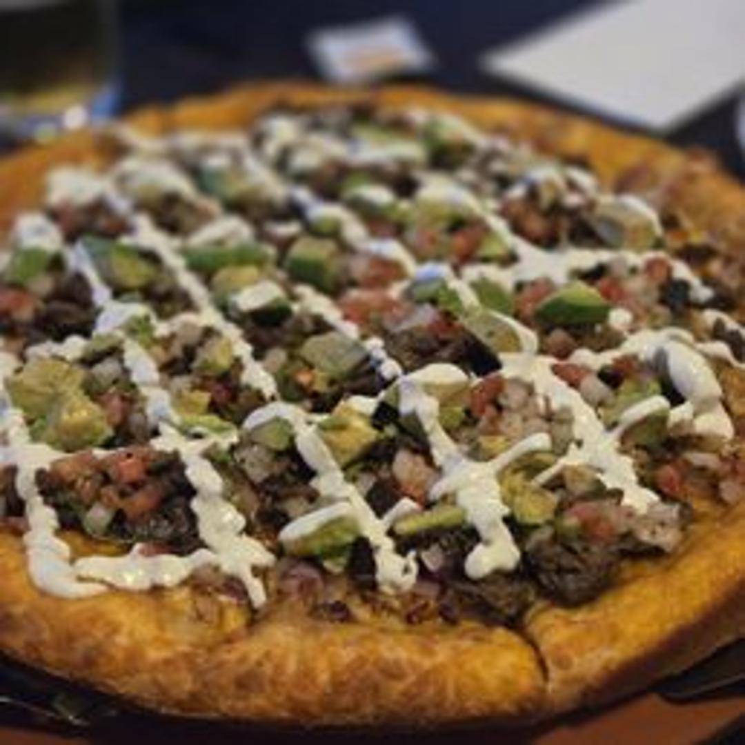 A fusion pizza featuring Korean and Mexican flavors. Toppings include marinated short rib, pico de gallo, a drizzle of crema, and a sprinkle of cilantro, all on a crispy, thin crust.