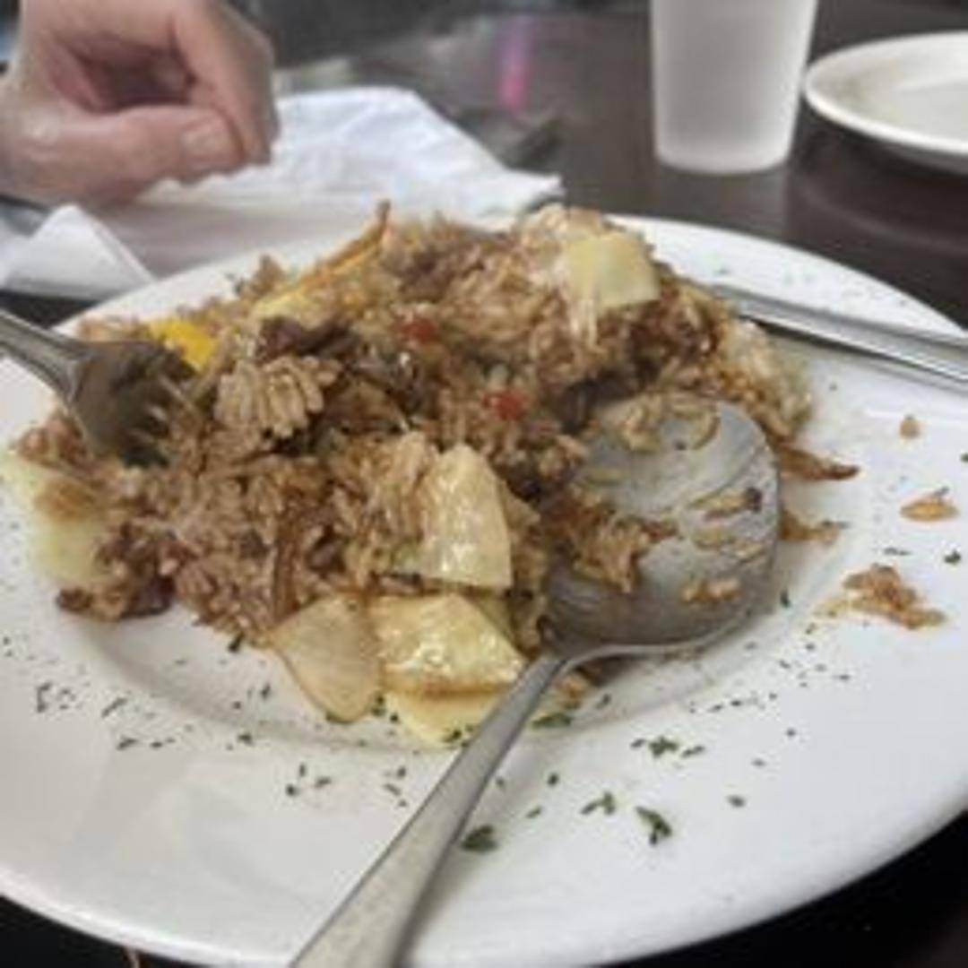 Savory fried rice inspired by Korean flavors. Features seasoned rice stir-fried with vegetables, protein (specify if any - e.g., kimchi, beef, chicken, or tofu), and a special blend of Korean spices and sauces. Often topped with a fried egg and sesame seeds for added richness and texture.