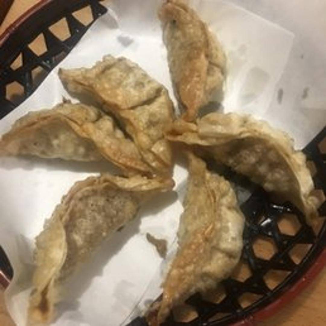 Pan-fried Japanese dumplings filled with a savory mixture of ground meat (typically pork), vegetables (such as cabbage and garlic chives), and seasonings. Served with a dipping sauce of soy sauce, vinegar, and chili oil.