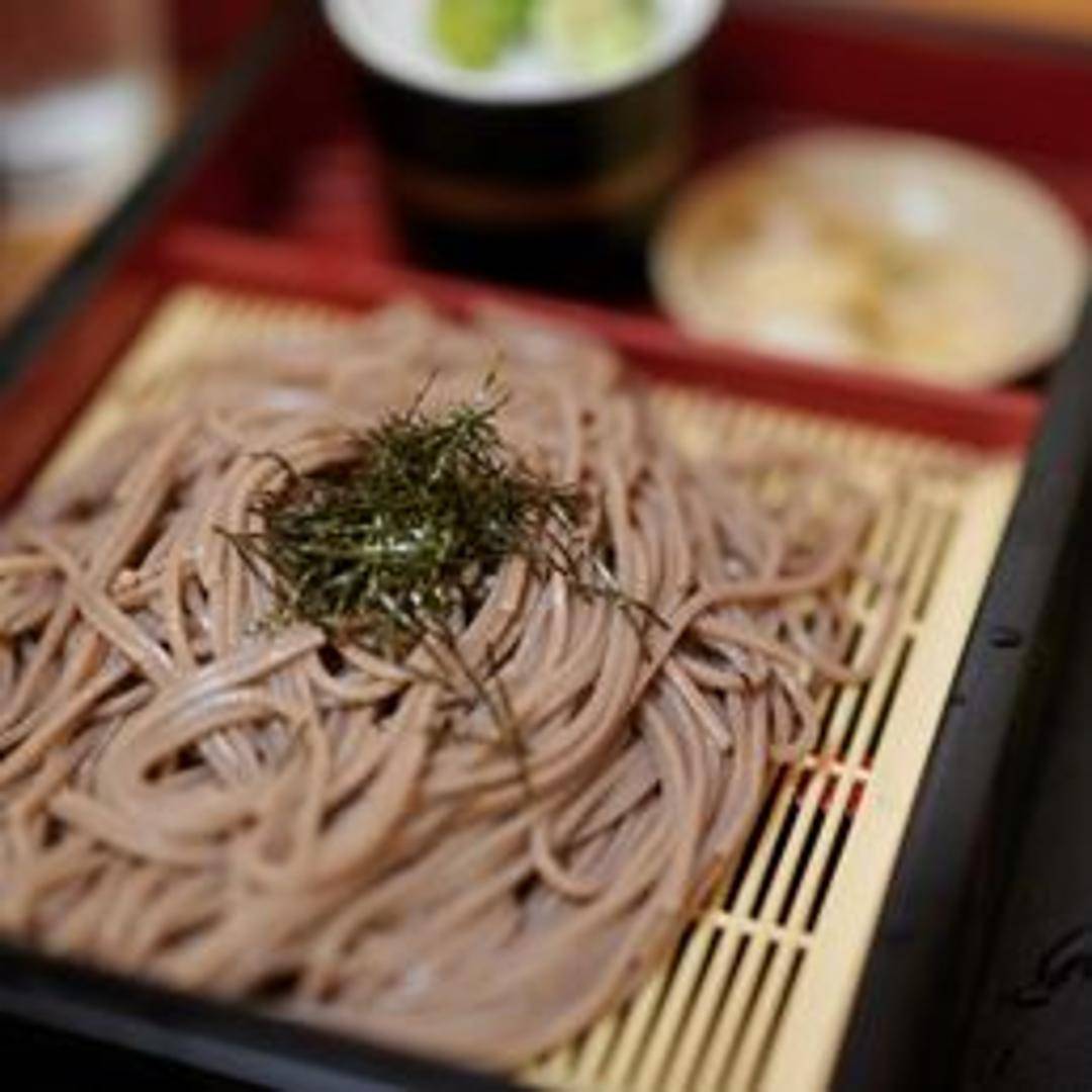 Chilled buckwheat noodles served on a bamboo draining basket ('zaru'). Accompanied by a cold dipping sauce (tsuyu) made with dashi, soy sauce, and mirin, and condiments such as wasabi and green onions.
