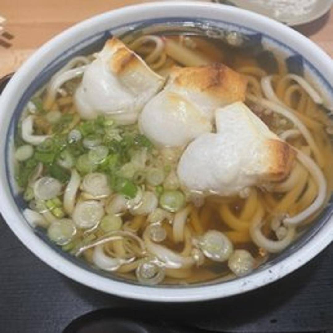 A hearty bowl of thick, chewy udon noodles in a savory, umami-rich dashi broth. Topped with grilled mochi cakes (chikara) for a delightful chewy texture and nutty flavor. Garnished with scallions.