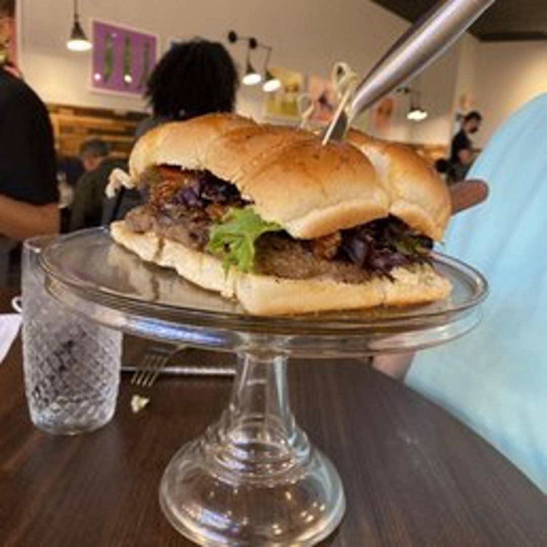 Three mini beef patties topped with melted cheddar cheese, caramelized onions, and a tangy aioli on toasted slider buns.