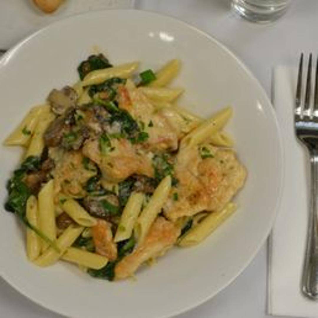 Pan-seared or grilled chicken breast served over a bed of wilted spinach in a creamy Florentine sauce. The sauce typically consists of cream, parmesan cheese, garlic, and other seasonings.