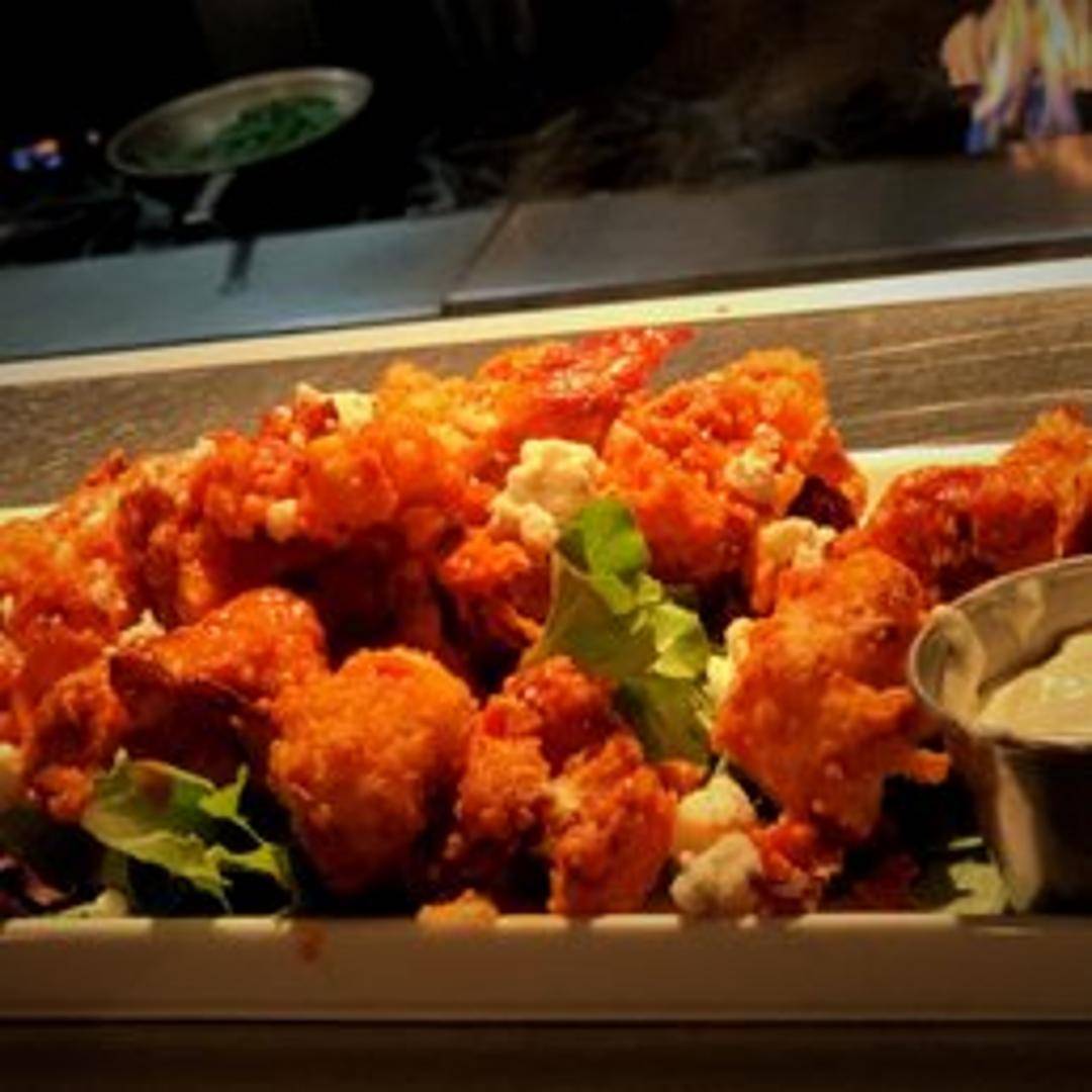 Cauliflower florets battered and fried, then tossed in a spicy buffalo sauce. Served with a side of blue cheese or ranch dressing for dipping. May include celery sticks.