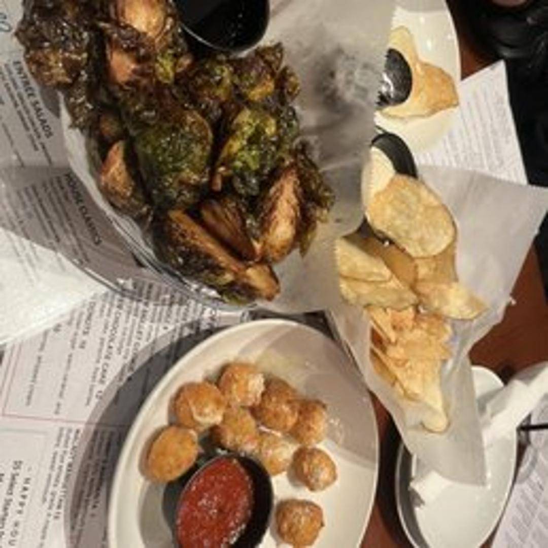 Brussels sprouts fried to a crispy perfection, tossed in a flavorful sauce (chef's choice), and often garnished with toasted nuts or seeds for added texture.