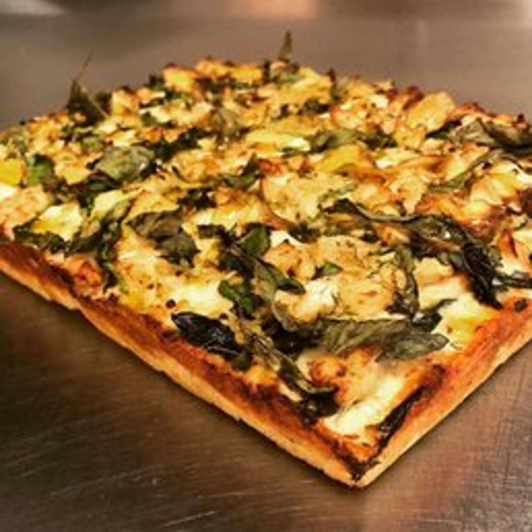 A delicious pizza featuring a garlic-infused base, topped with tender pieces of chicken, mozzarella cheese, and other complementary pizza toppings. Exact toppings may vary; please check with Krave Pizzeria for specifics.