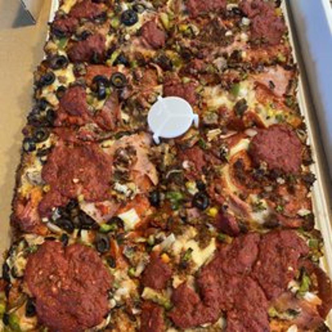 A large, round pizza featuring a classic blend of mozzarella cheese, pepperoni, Italian sausage, green peppers, onions, mushrooms, black olives, and your choice of crust and sauce.