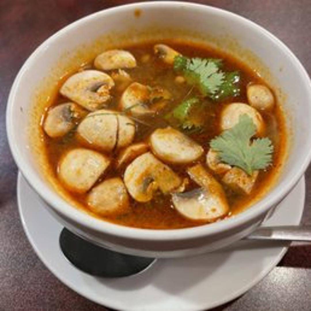 A hot and sour Thai soup with lemongrass, galangal, kaffir lime leaves, mushrooms, tomatoes, and your choice of protein. Seasoned with chili paste and lime juice.
