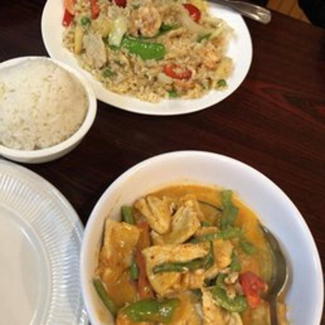 A rich and creamy red curry with coconut milk, bell peppers, basil leaves, and your choice of protein (chicken, beef, pork, or tofu). Served with steamed rice.