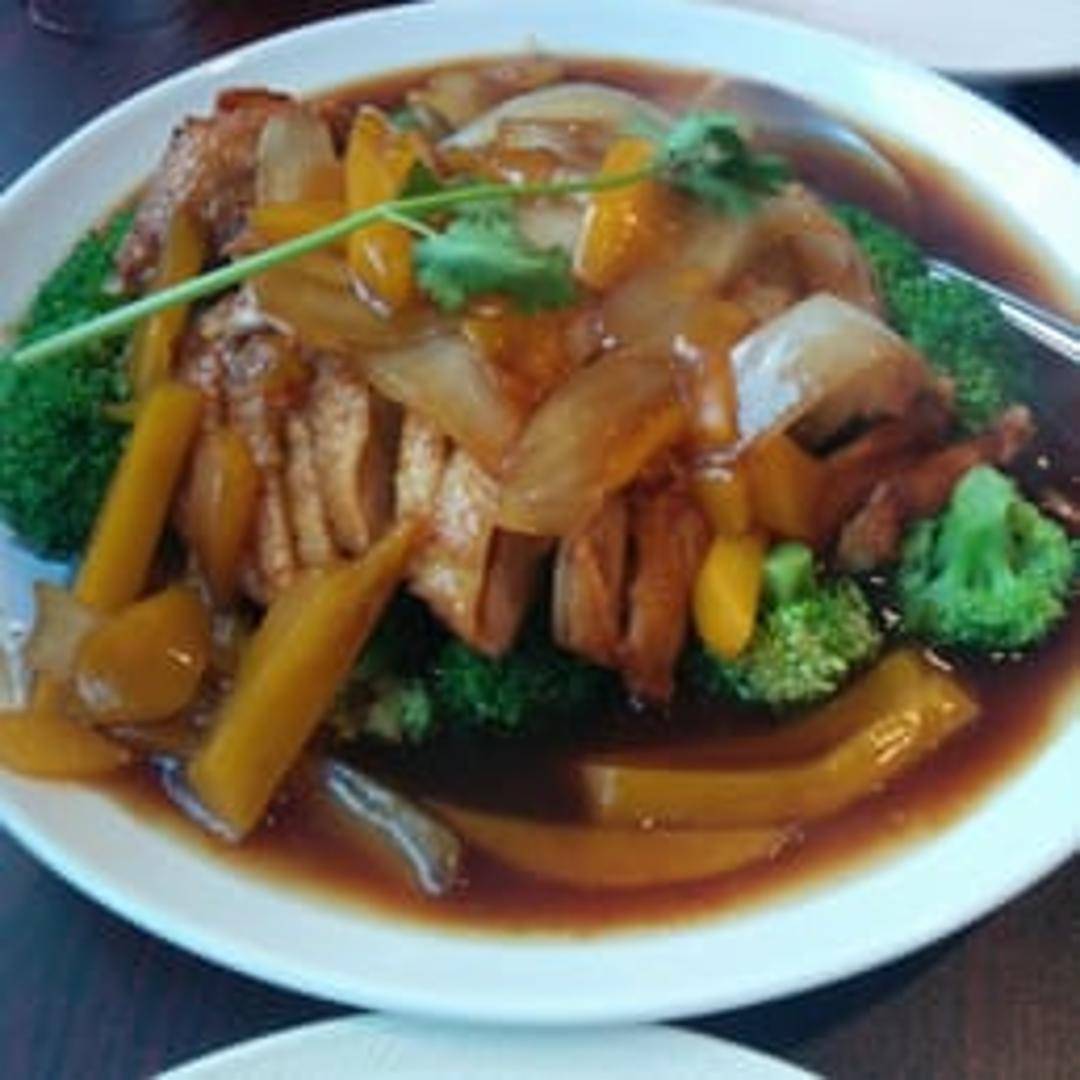 Crispy roasted duck breast served with a sweet and tangy mango sauce, bell peppers, and onions. A delightful combination of textures and flavors, served with steamed rice.