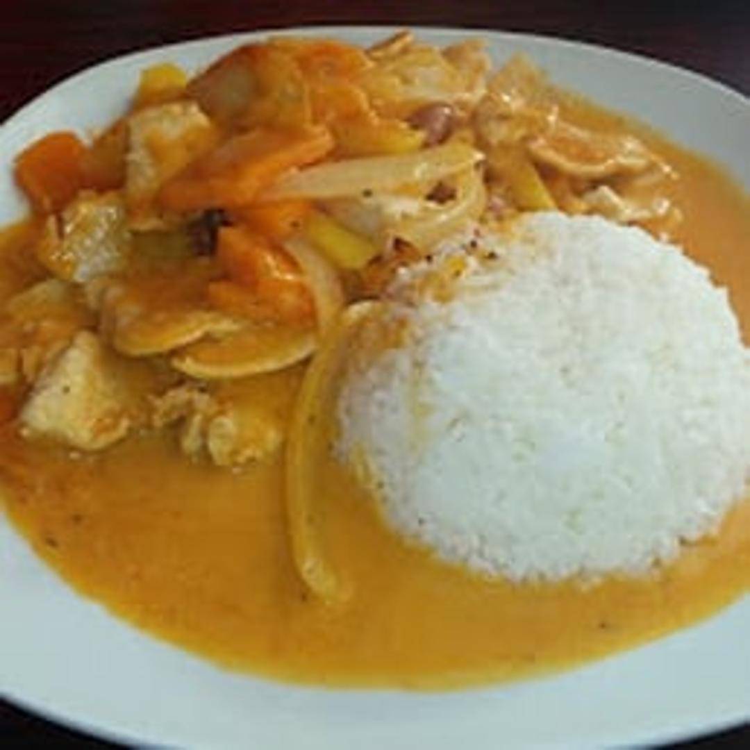 A sweet and savory curry with fresh mango, coconut milk, bell peppers, onions, and your choice of protein. Served with steamed rice.
