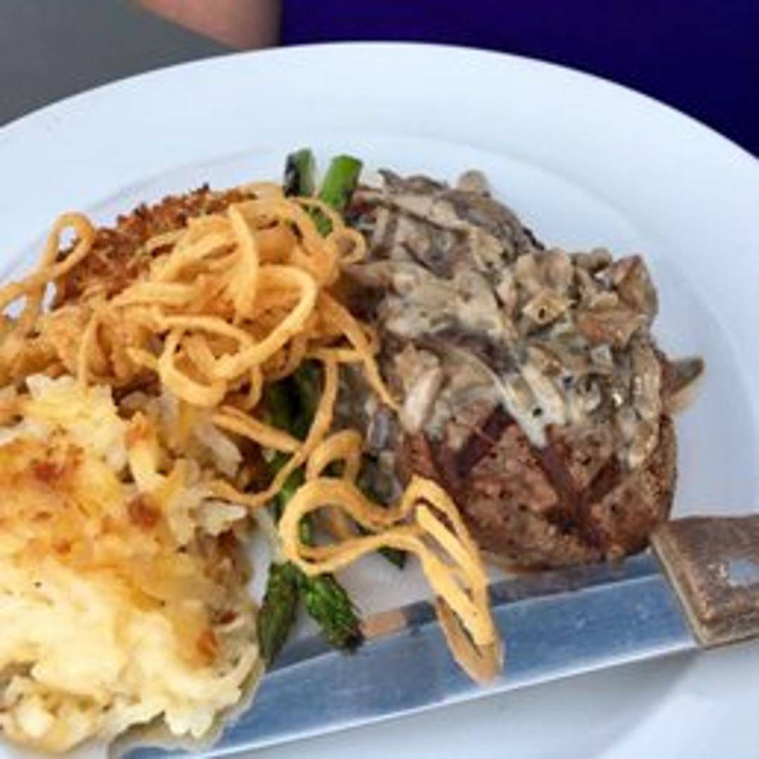 Two grilled beef tenderloin filets topped with a creamy summer ranch dressing, served with mashed potatoes and seasonal vegetables.