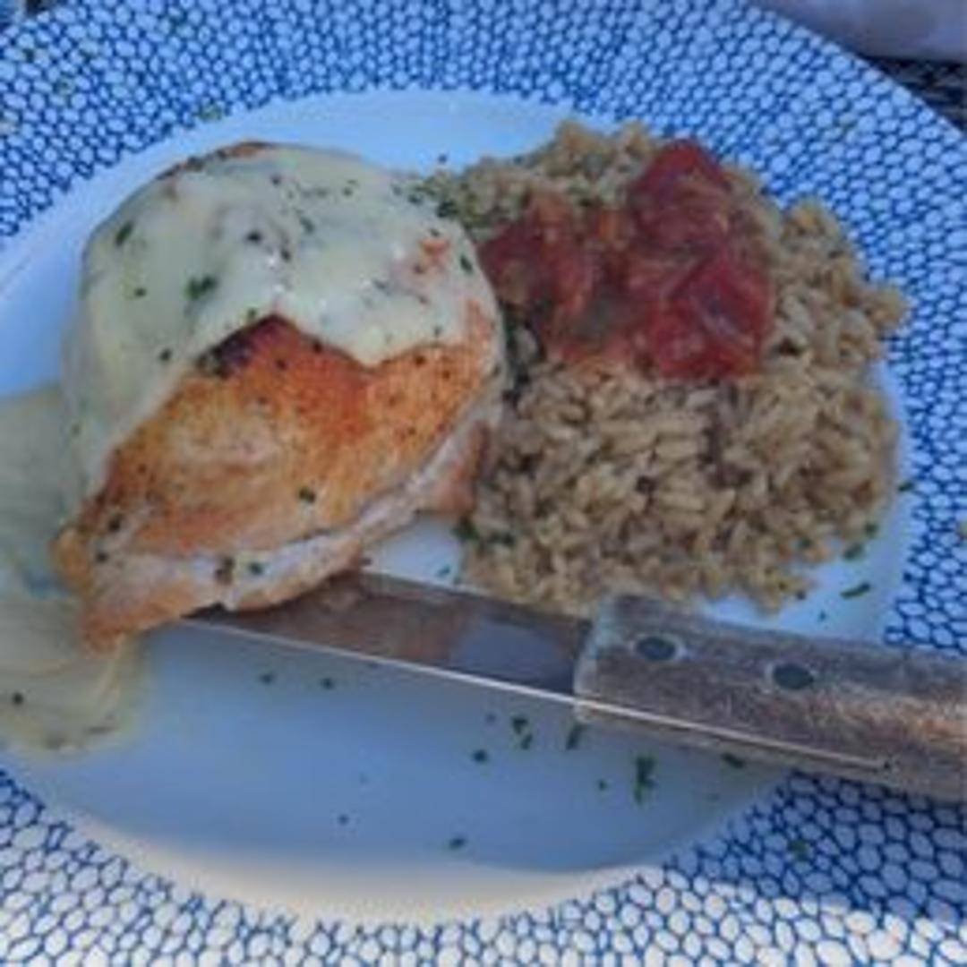 Pan-fried chicken breast topped with a creamy crab sauce, served with rice pilaf and asparagus.