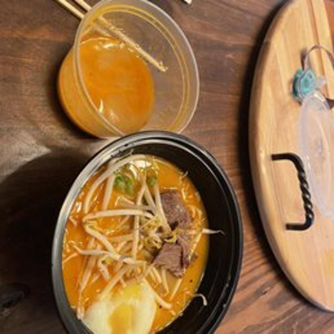 A hearty ramen featuring a spicy beef broth, tender slices of beef, chili oil, and assorted vegetables. A fiery and flavorful experience.