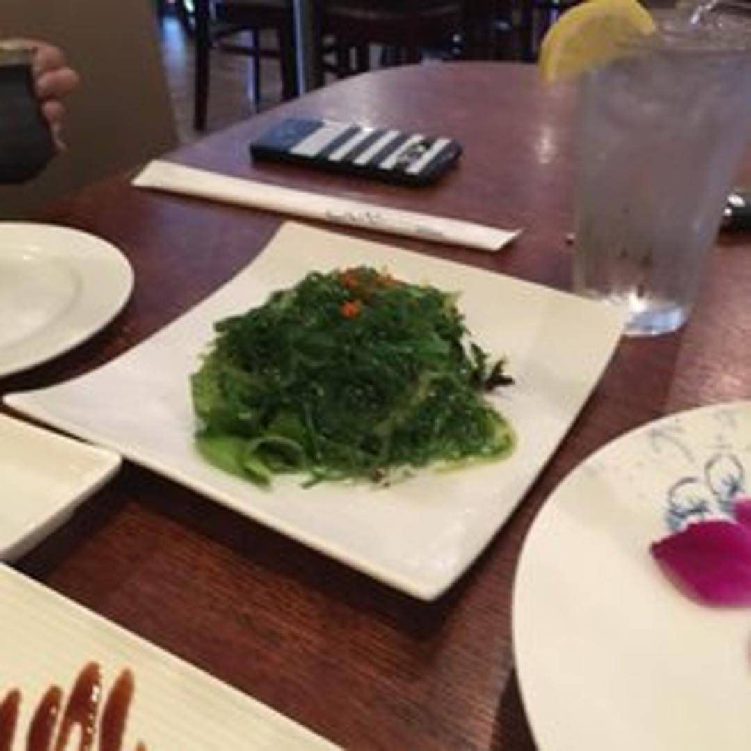 A vibrant and refreshing Japanese-style salad made primarily from various types of edible seaweed, typically seasoned with a light and savory dressing composed of sesame oil, rice vinegar, soy sauce, and a hint of sweetness. Often garnished with toasted sesame seeds for added flavor and texture.