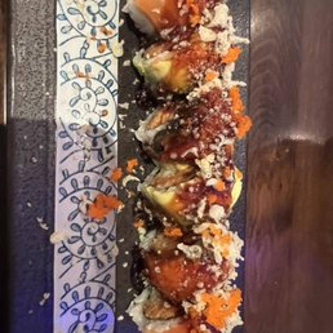A dynamic and flavorful specialty sushi roll, often featuring a base roll (such as a California roll or a roll with crab stick and cucumber) topped with a generous mound of baked or torched seafood mix, typically including ingredients like scallops, crab, or shrimp, blended with a spicy mayonnaise or special creamy sauce, and often garnished with masago or scallions.