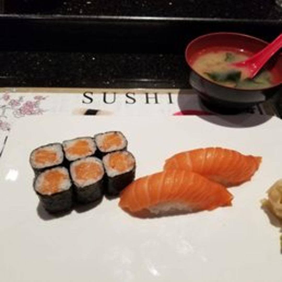 A classic sushi roll featuring fresh, thinly sliced salmon, often combined with rice and nori (seaweed), and sometimes including other ingredients like avocado or cucumber. Served with traditional accompaniments such as soy sauce, wasabi, and pickled ginger.