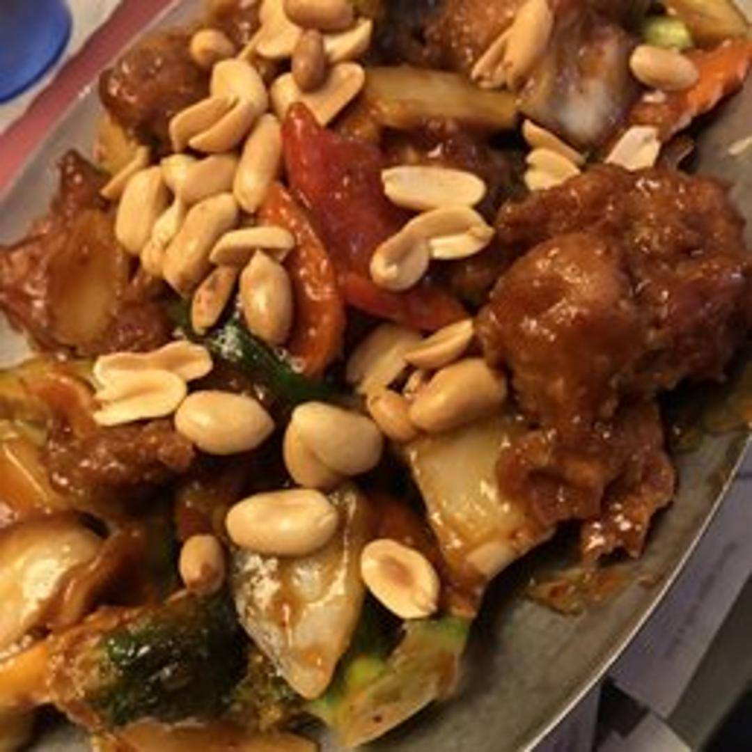 Ignite your taste buds with Kung Pow, a fiery and flavorful Szechuan-inspired stir-fry. This bold dish typically features tender diced chicken, crunchy peanuts, and a colorful array of vegetables like bell peppers and zucchini, all coated in a complex sauce that balances sweet, sour, and distinctly spicy notes from dried chili peppers. It delivers a satisfying kick and a rich, savory depth.