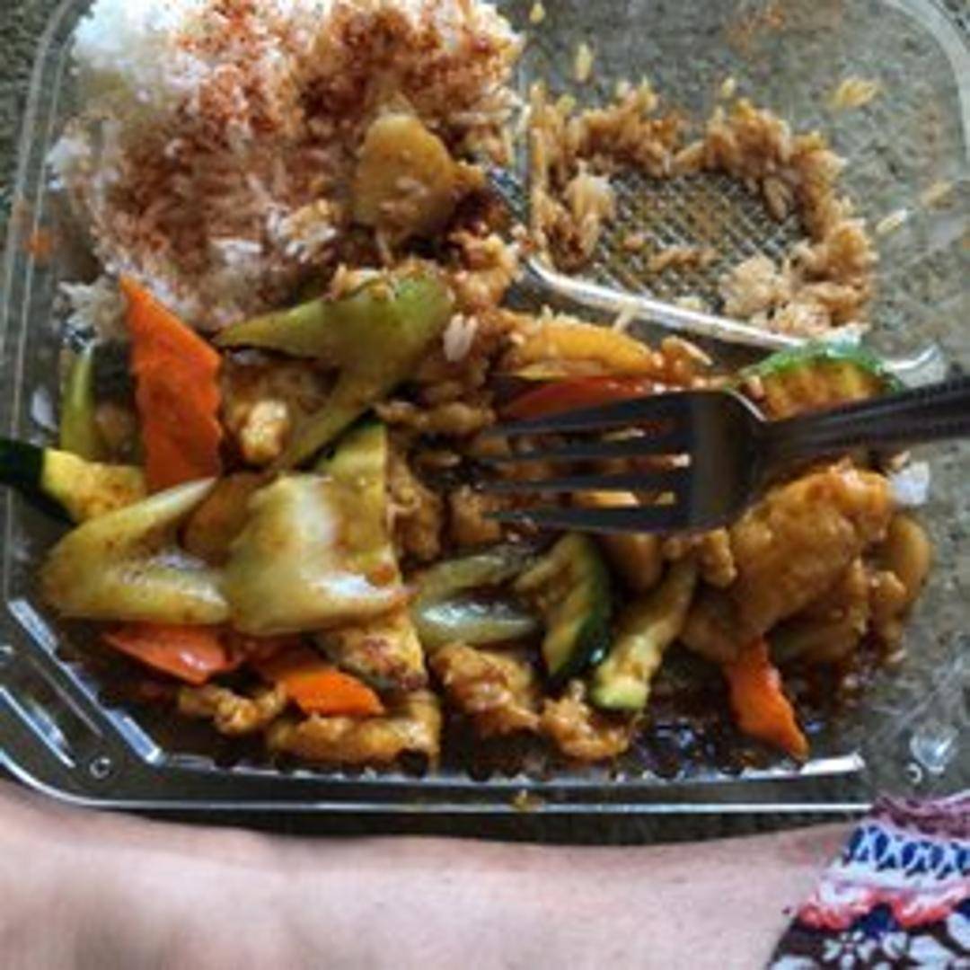 Tender chicken stir-fried with roasted cashews, diced vegetables (such as celery, carrots, and water chestnuts), and a light savory brown sauce. Served with a side of white rice.