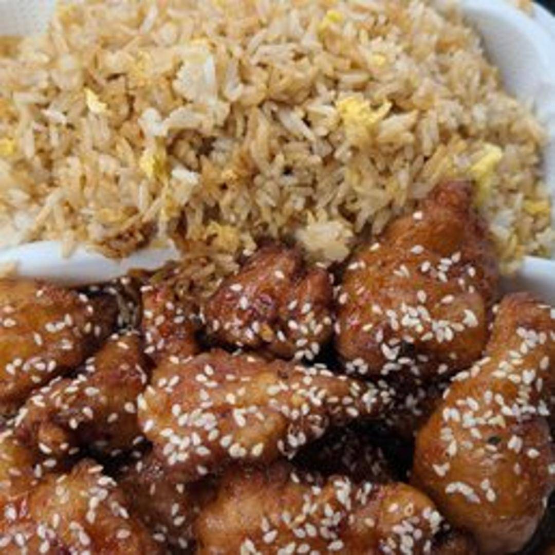 Crispy, golden-brown chicken pieces coated in a sweet and savory sesame sauce, garnished with sesame seeds. Served with your choice of rice.