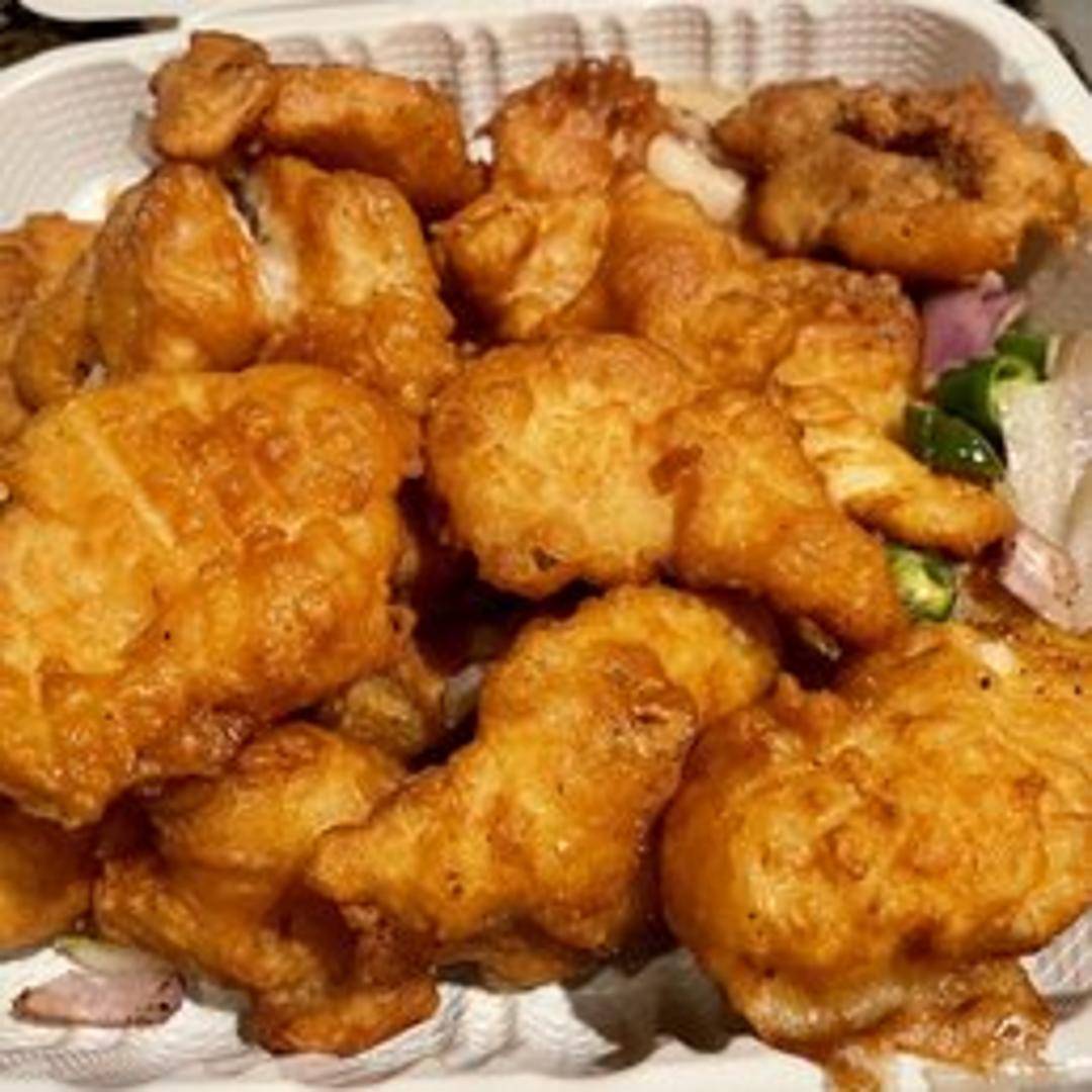 Lightly battered and fried fish fillet seasoned with a blend of salt, pepper, and spices. Often includes fried garlic and chili peppers for extra flavor.