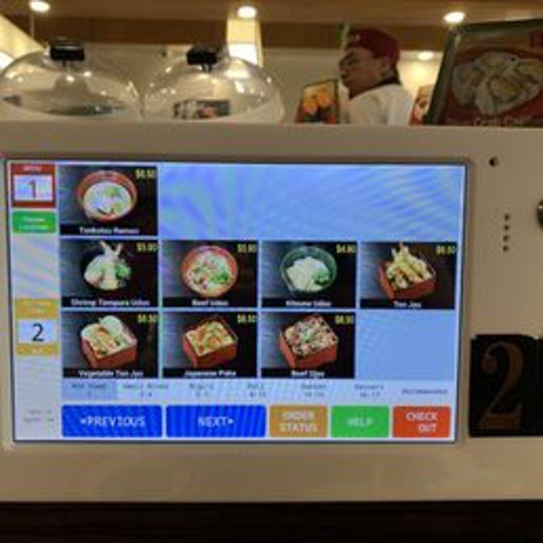 A tablet device used for ordering items and interacting with the Kura Revolving Sushi Bar ordering system. Functions include browsing the menu, placing orders, calling for assistance, and paying the bill.