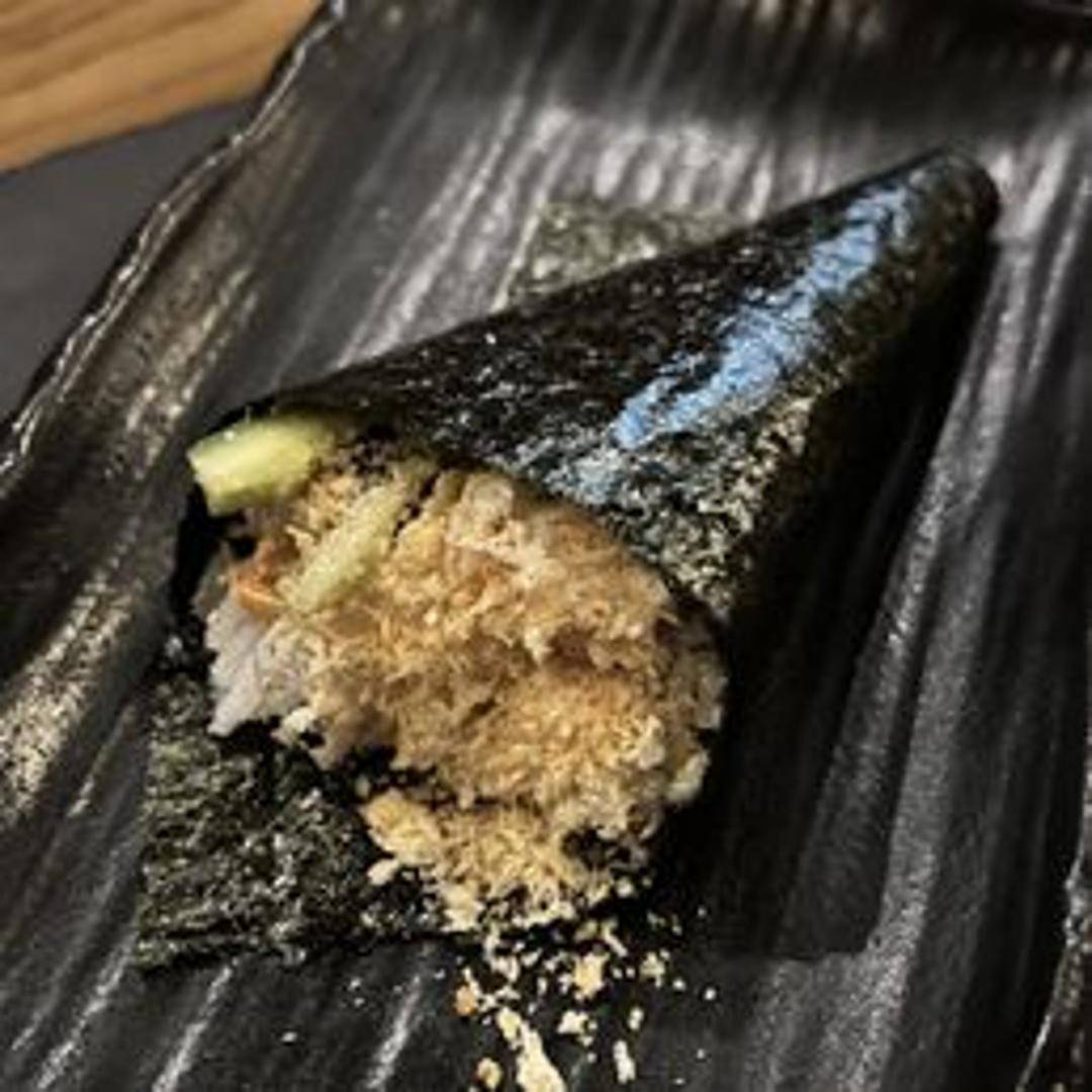 A freshly prepared hand roll filled with succulent crab meat, crispy tempura flakes for texture, creamy avocado, and a hint of spicy mayo. Wrapped in nori seaweed, it's a delightful explosion of flavors and textures in every bite. Enjoy immediately for optimal crunch and freshness.