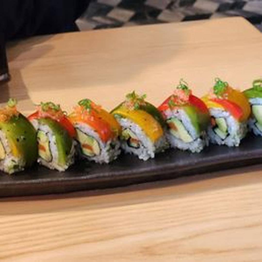 A visually stunning sushi roll with crab meat, avocado, and cucumber inside, topped with an assortment of fresh fish such as tuna, salmon, yellowtail, and avocado. Often served with soy sauce and wasabi.