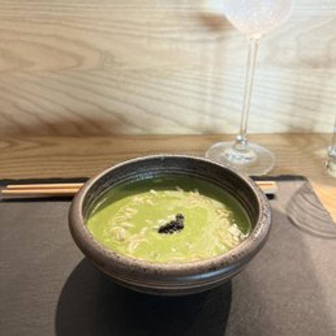 A creamy and vibrant green soup made from fresh edamame. Lightly seasoned and blended to a smooth consistency, it offers a refreshing and healthy start to any meal. Garnished with microgreens and a swirl of cream.