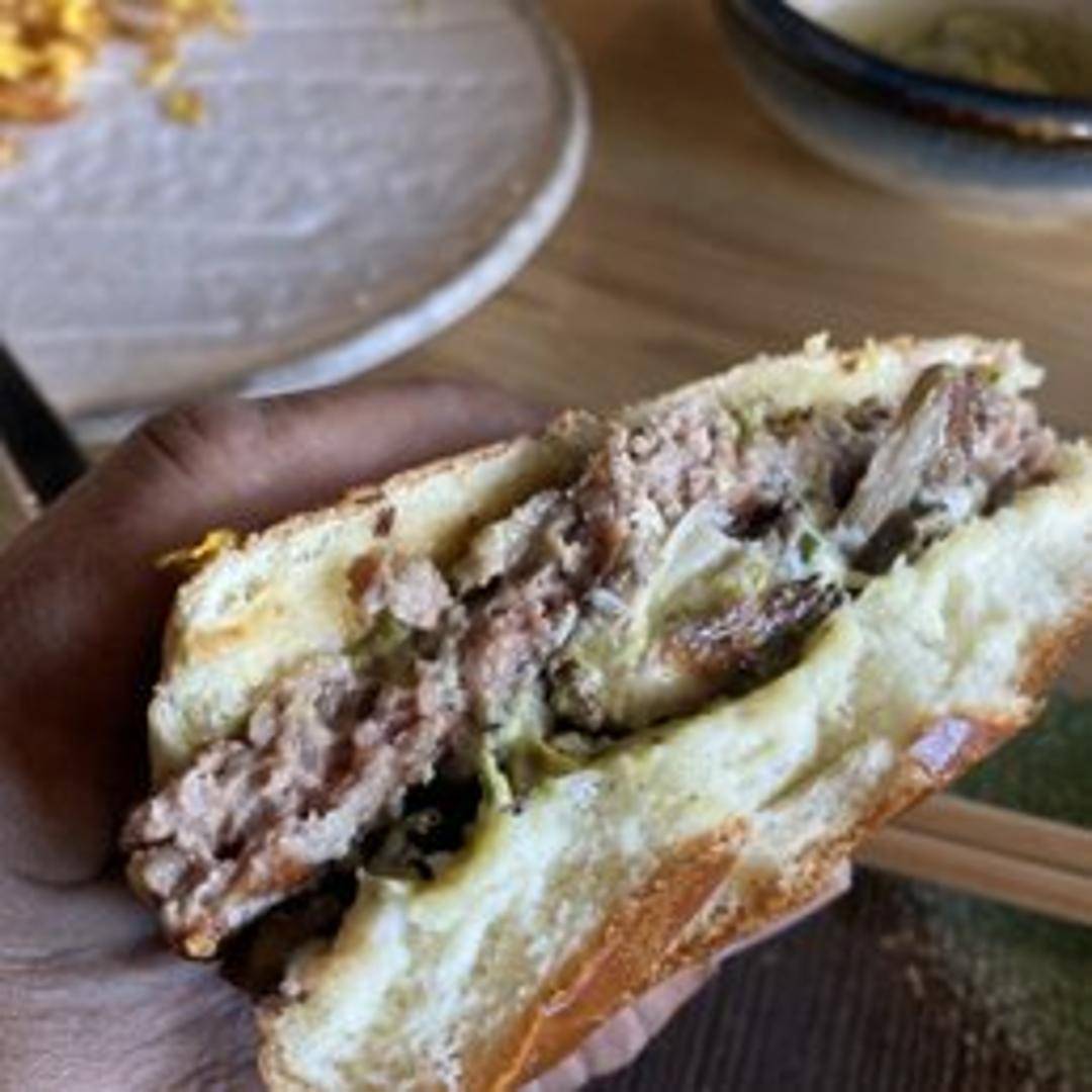 A savory burger highlighting a medley of sautéed mushrooms, often including varieties like shiitake and oyster mushrooms, topped with melted cheese, caramelized onions, and a garlic aioli, served on a toasted bun.