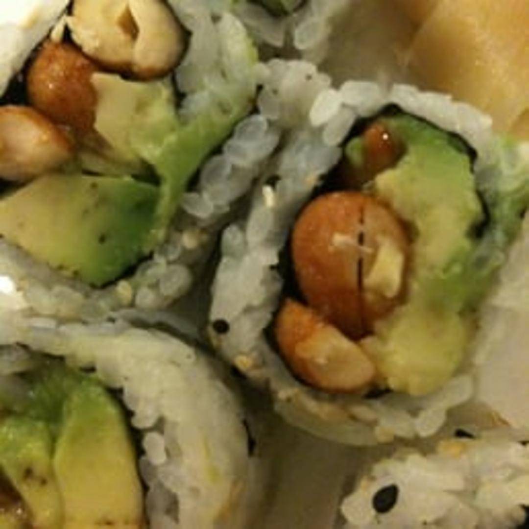 A delightful vegetarian sushi roll combining the rich, nutty flavor of peanuts, often in a sauce or crushed form, with the smooth, buttery texture of fresh avocado, encased in seasoned sushi rice and nori (seaweed) for a satisfying and unique taste.