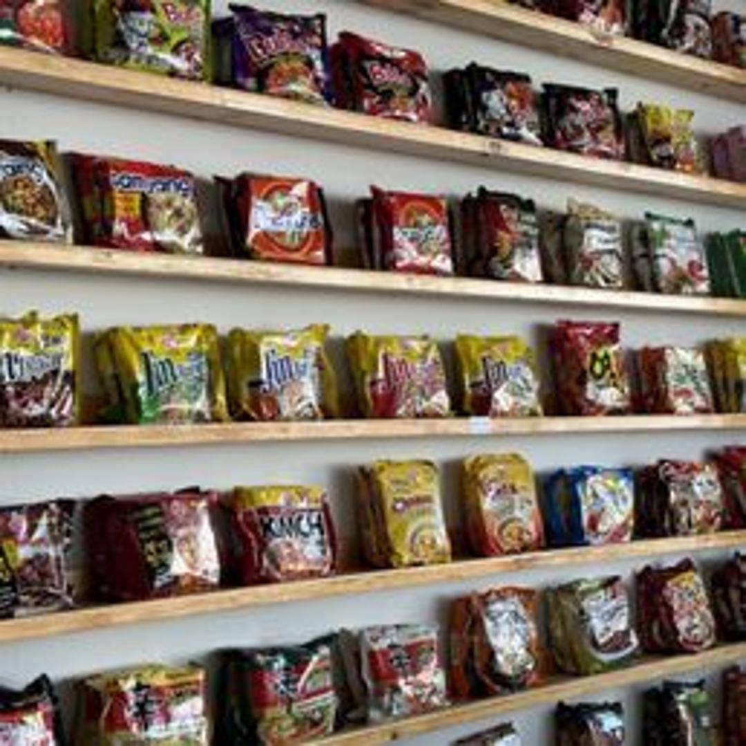 An assortment of various instant ramen noodle packages displayed attractively, allowing customers to choose from a wide selection of flavors and brands.