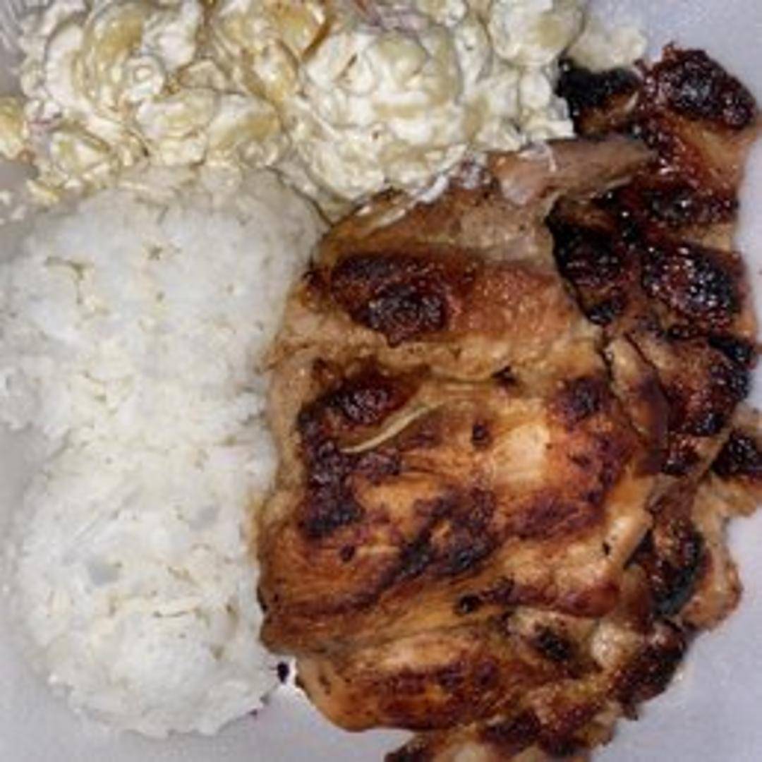Grilled or baked chicken marinated in a sweet and savory Hawaiian barbecue sauce, served with steamed rice and macaroni salad.