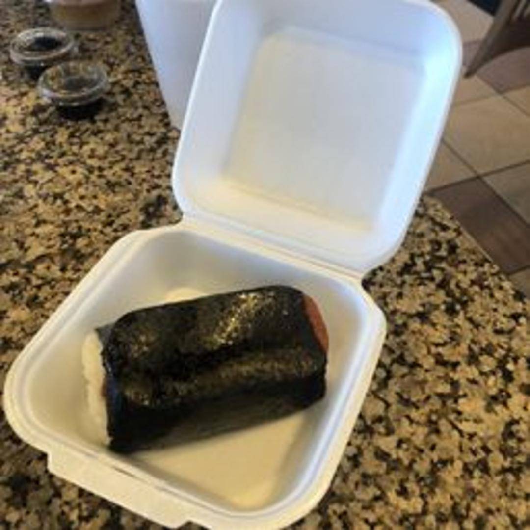 A popular snack: a slice of grilled Spam atop a block of rice, wrapped together with nori seaweed.