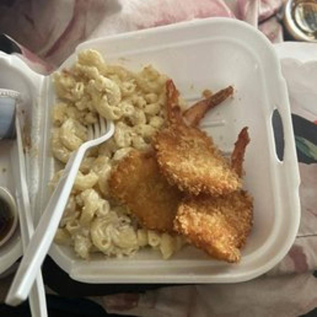 Crispy, golden-brown fried shrimp served with a dipping sauce, rice, and macaroni salad.