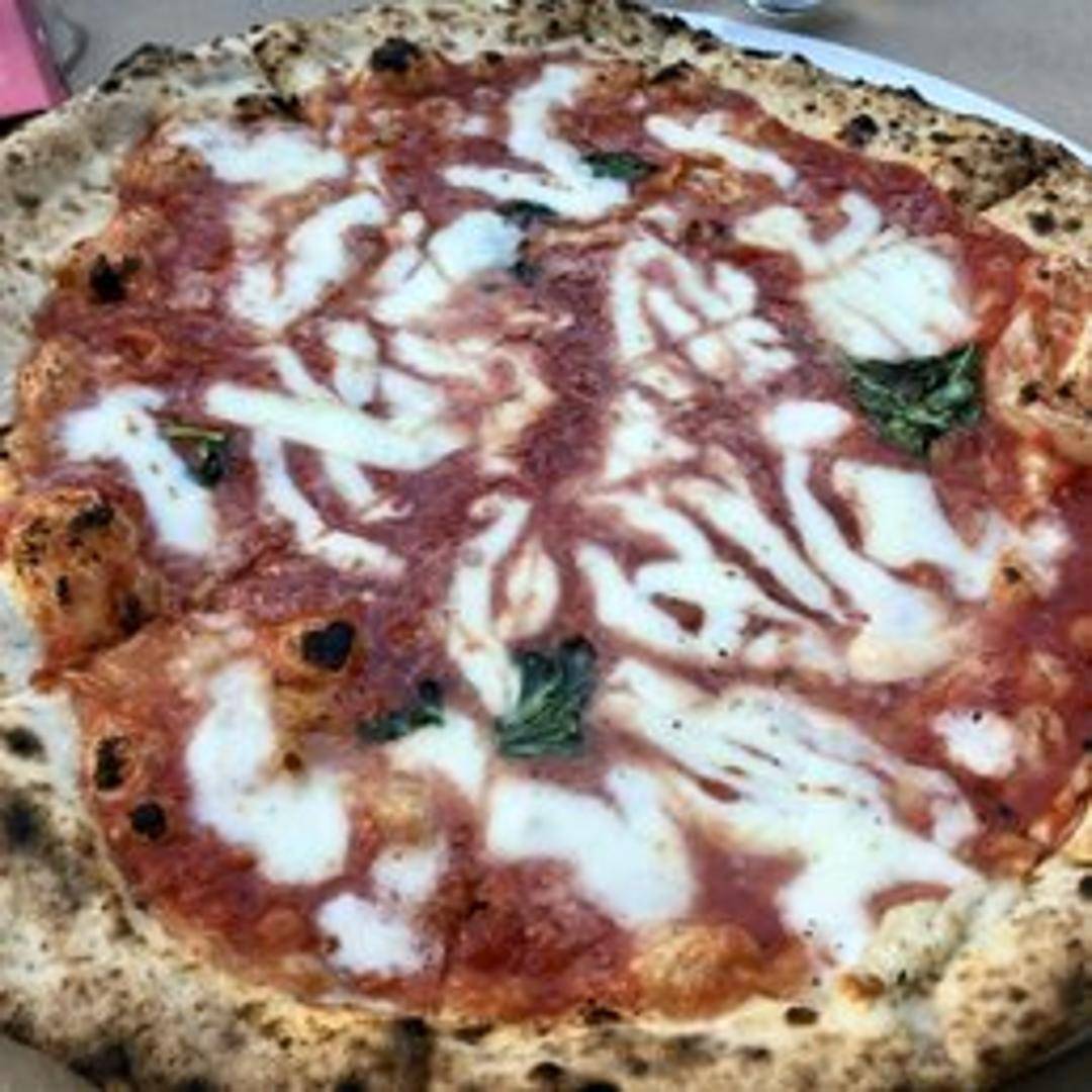 A traditional Neapolitan pizza with a thin, soft crust, made with San Marzano tomatoes, fresh mozzarella, basil, and extra virgin olive oil. Cooked in a wood-fired oven for a slightly charred and blistered crust.