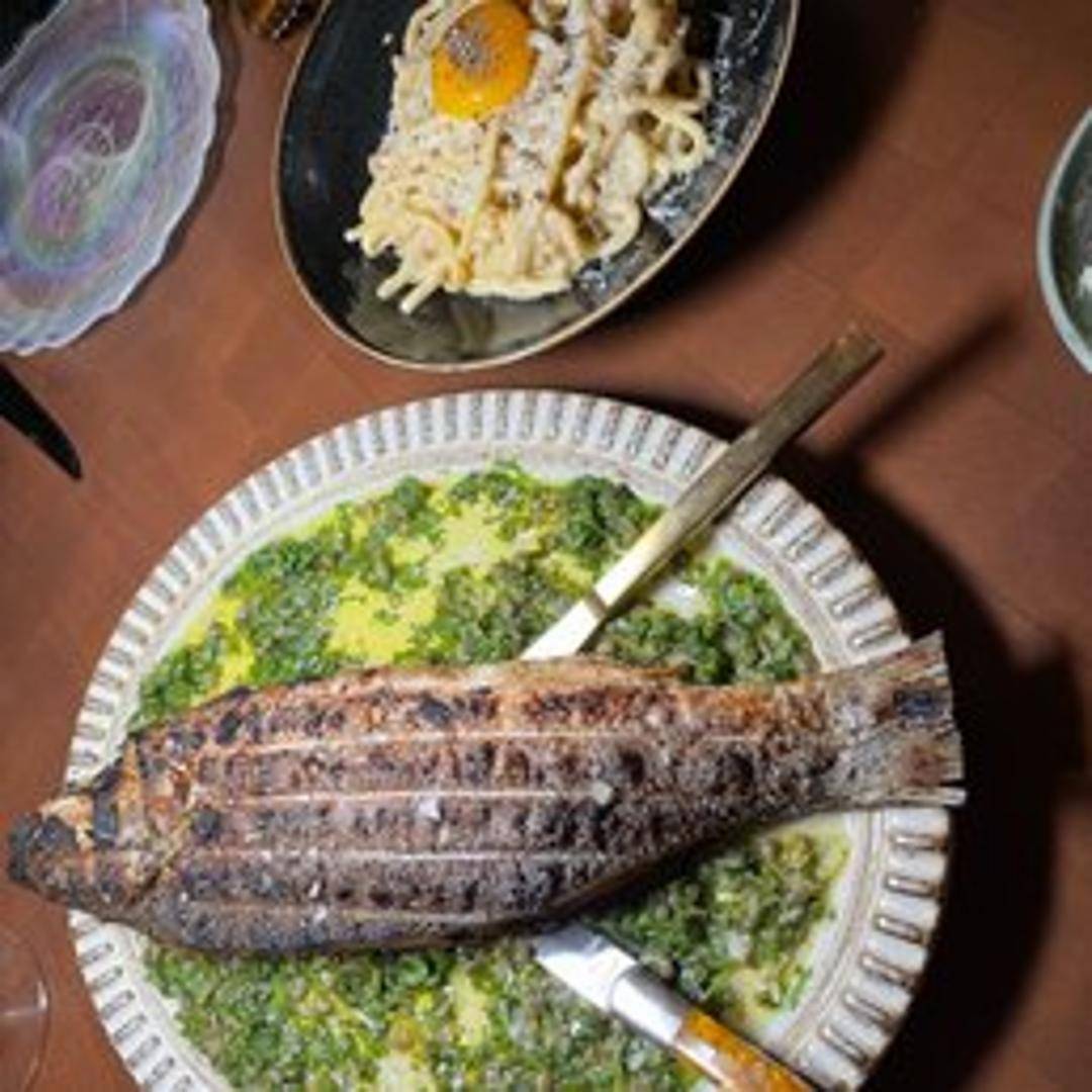 A whole Mediterranean sea bass, or branzino, masterfully grilled until its skin is perfectly crispy and the delicate, flaky white flesh is moist and tender. Lightly seasoned with sea salt, fresh herbs, and a drizzle of extra virgin olive oil, this dish embodies simple elegance and fresh coastal flavors.