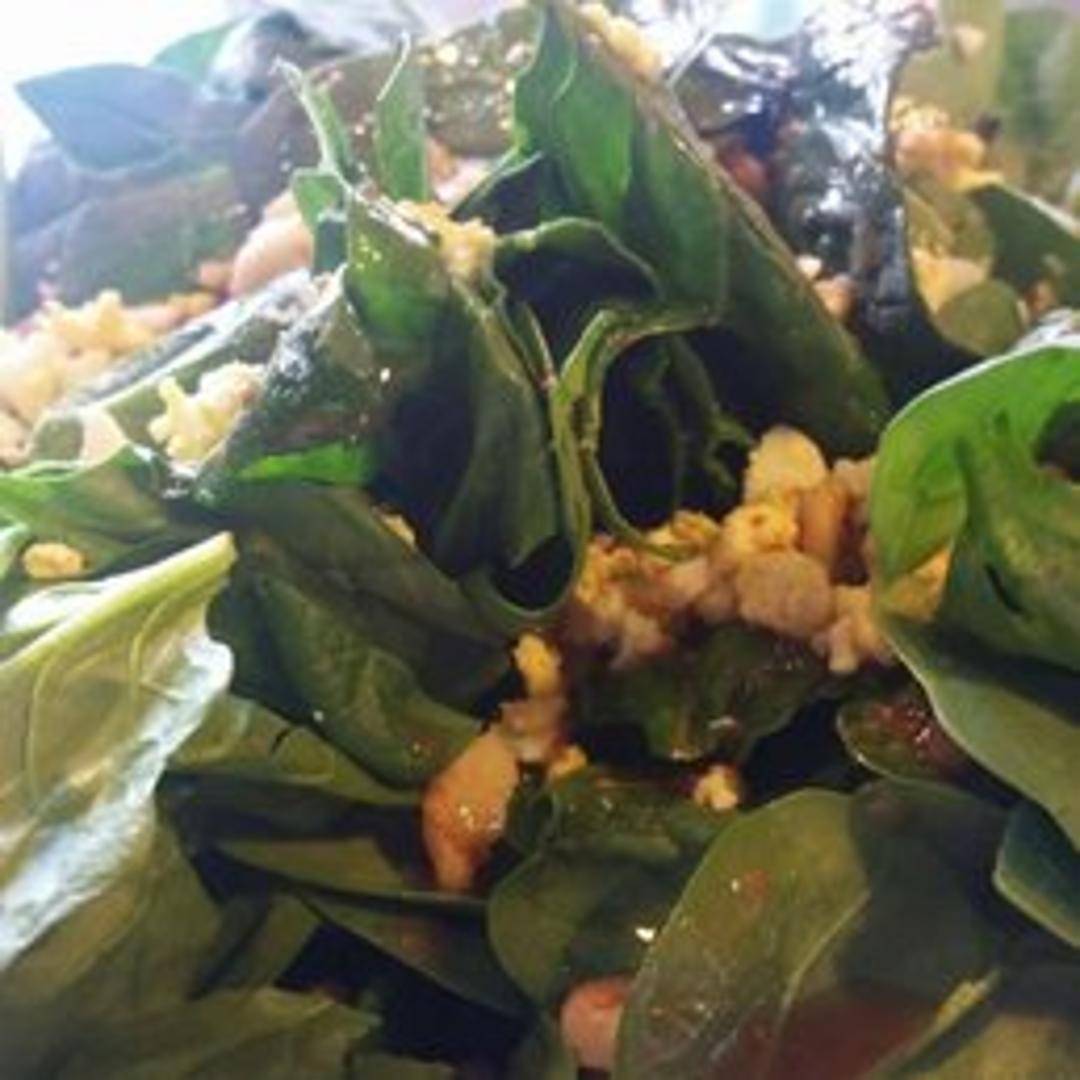 Fresh spinach leaves tossed with a variety of toppings, such as crumbled cheese, toasted nuts, bacon bits, and a tangy vinaigrette dressing.