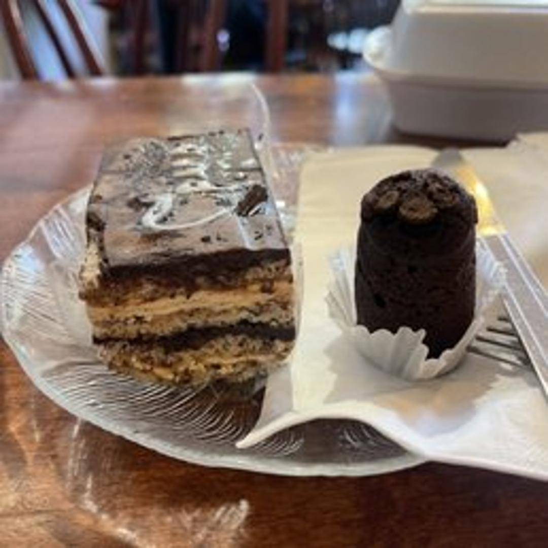 A classic French Opera cake. Features layers of almond sponge cake soaked in coffee syrup, layered with chocolate ganache and coffee buttercream, and coated in a smooth chocolate glaze. A rich and decadent dessert with a complex flavor profile.