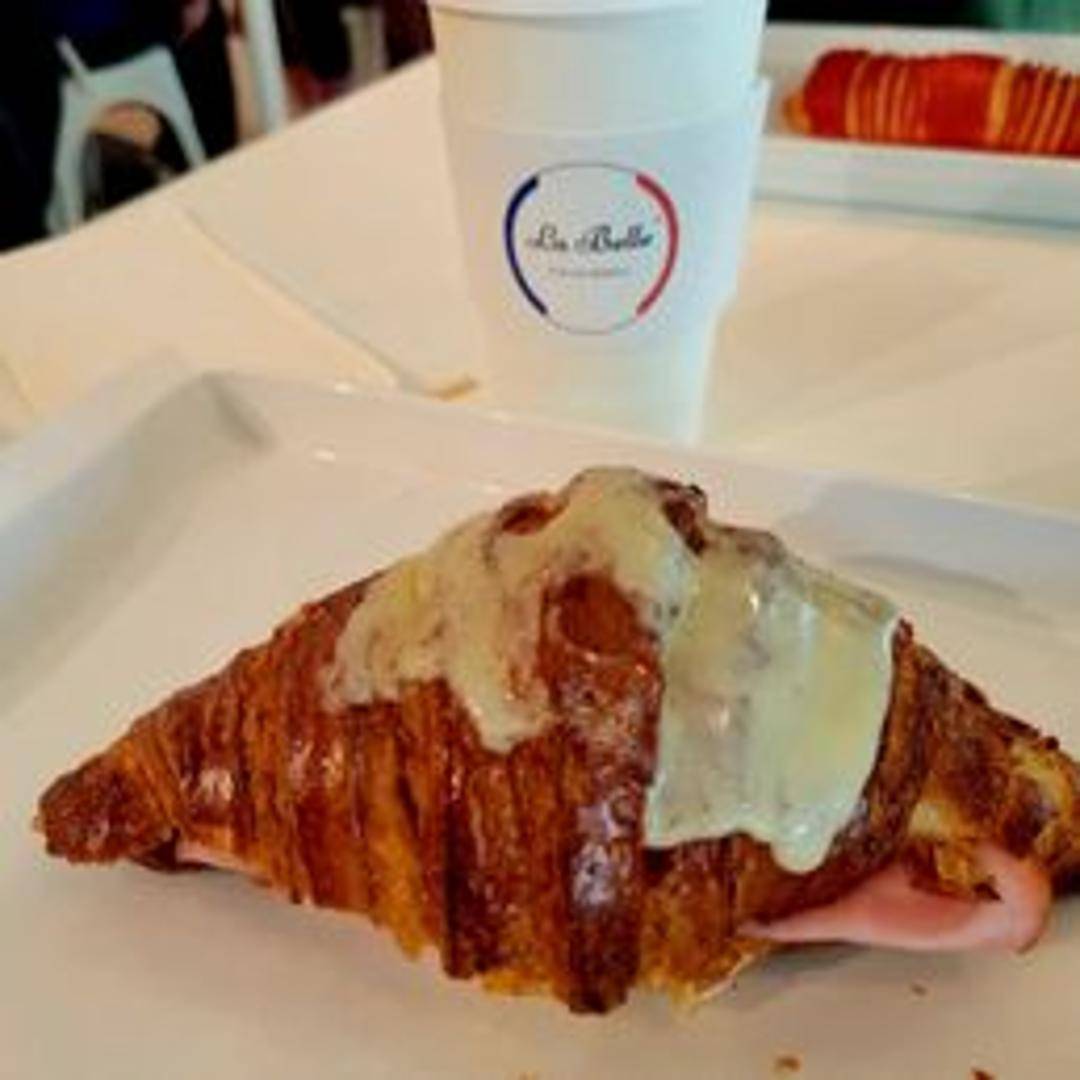 A croissant filled with savory ham and melted cheese, offering a combination of flaky pastry, salty ham, and creamy cheese.